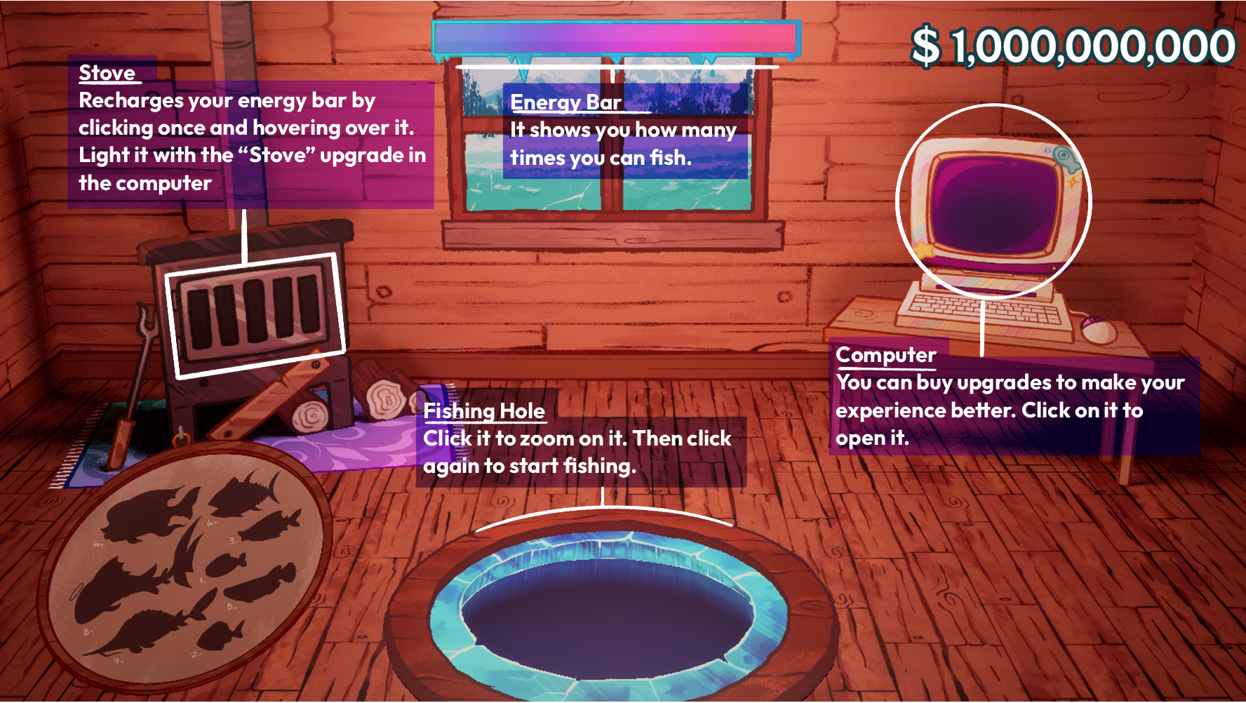 Catch all the fishes of this frozen landscape! Type a word to reel them in, work your way through the rarer species, make money and buy upgrades to make your experience smoother. You might even be able to catch the legendary beast of the lake...