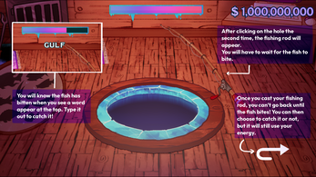 - After clicking on the hole for the second time you will have to wait for the fish to bite, it might take a bit, it is intentional. You will know it has when a word appears on the top;